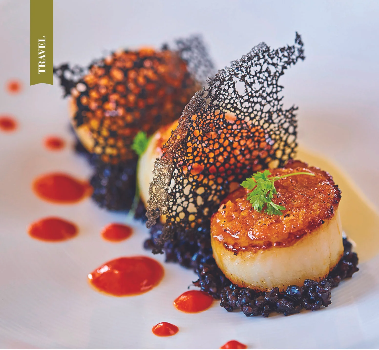 Romesco Butter Sea Scallop served with black rice and piquillo pepper coulis