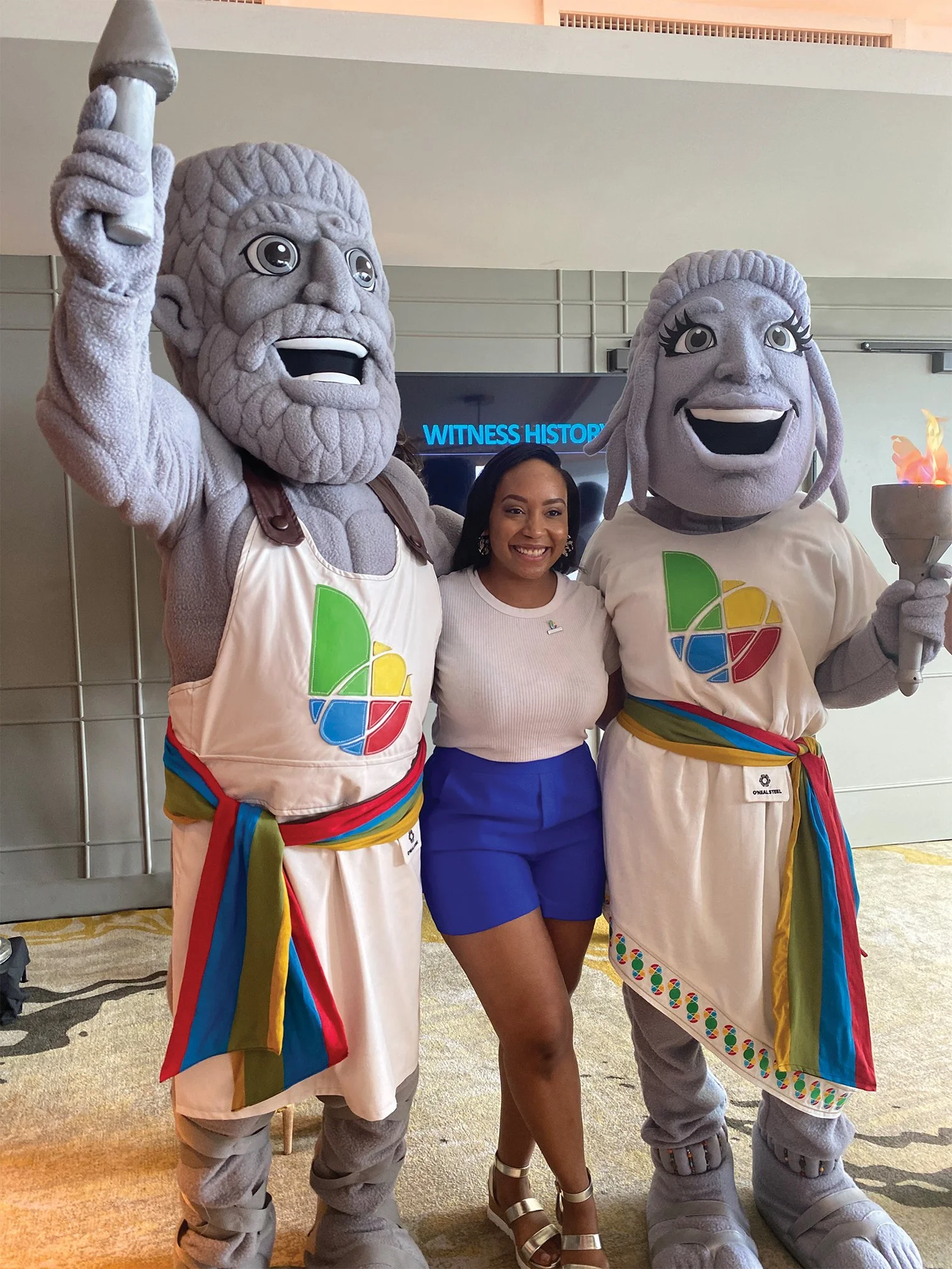 Mariah Gullatte with Vulcan and Vesta, the mascots of the 2022 World Games in Birmingham